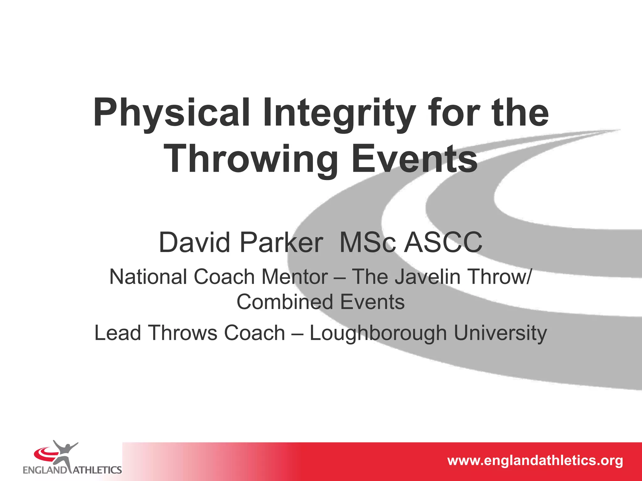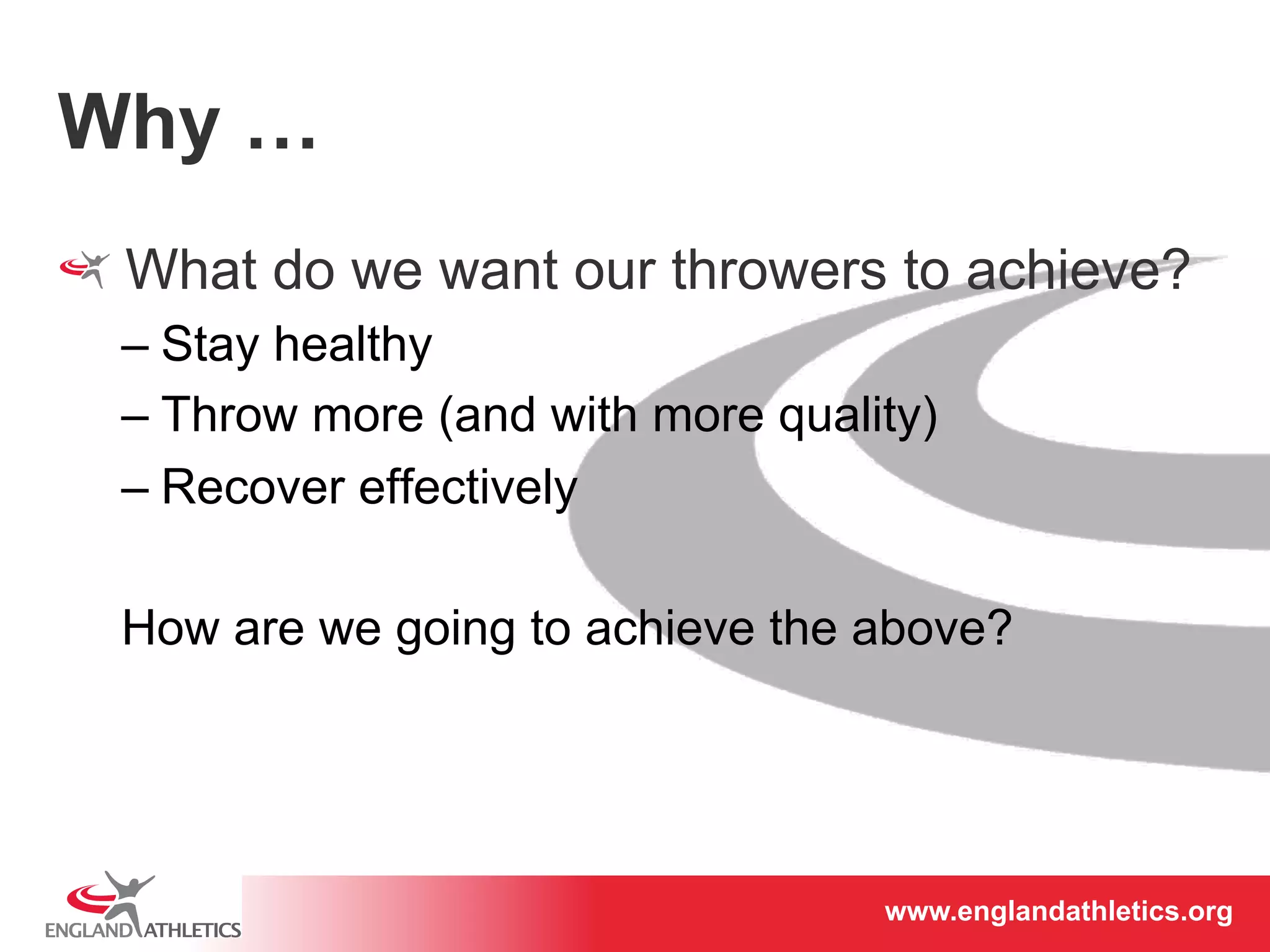 This document discusses physical integrity and injury prevention for throwing events. It addresses common throwing injuries and mobility issues that can lead to them. Specific joints are identified as needing mobility or stability, and how tightness or weakness in certain muscles can impact posture, performance, and injury risk. Exercises are suggested to address mobility limitations that could hinder throwing technique or increase injuries, focusing on the shoulder, thoracic spine, and hip. Maintaining proper joint mobility and muscular balance is important for throwers to stay healthy, throw with more quality, and recover effectively.