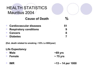 The document discusses the risk factors for chronic diseases in Mauritius, with a focus on obesity. It summarizes the results of several national surveys from 1987-2004 that found high rates of obesity and other risk factors like diabetes, hypertension, and physical inactivity. Obesity levels were found to be increasing over time in both adults and children. Projections estimate that obesity rates in Mauritius could reach 30-40% by 2025 unless action is taken to address excessive eating, drinking, smoking, and sedentary lifestyles.