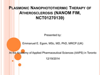 The document discusses a study on plasmonic nanophotothermic therapy for treating atherosclerosis, highlighting its potential to significantly reduce plaque burden compared to traditional therapies. The study involved 180 patients and demonstrated notable improvements in atheroma volume and cardiovascular outcomes with the new treatment method. The findings suggest plasmonic resonance therapy may effectively lead to regression of coronary atherosclerosis.