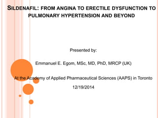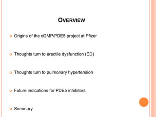 The document discusses the development of sildenafil, initially intended for treating angina but later recognized for its effectiveness in treating erectile dysfunction and pulmonary hypertension. It highlights key clinical trials and the drug's approval process, showing its evolution into a critical treatment for various conditions. Future indications include other circulatory issues, demonstrating sildenafil's broader therapeutic potential.