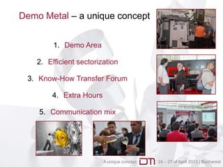 The Demo Metal 2013 event, held from April 24-27 in Bucharest, aims to showcase the latest trends and technologies in the metalworking industry through live demonstrations, sectorization of production flow, and a know-how transfer forum for training and presentations. The event targets various industries including automotive, aerospace, and energy, facilitating networking opportunities among industry professionals. Exhibitors will present a range of machinery and services, with an emphasis on creating an interactive communication relationship among participants.