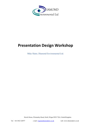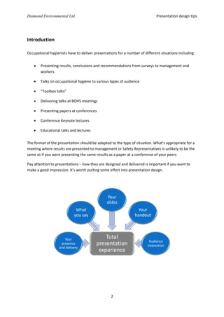 The document provides tips for designing effective presentations. It notes that presentations come in many forms, from reporting results to management to conference speeches. Good presentations have clear objectives, appropriate content for the time available, and engage the audience. Effective visual materials like slides should enhance the speaker's message, not serve as a script. The document outlines best practices for slide design, including using visuals over text and limiting content to key points. It also advises that handouts expand on the presentation instead of duplicating slides verbatim. Overall, the tips emphasize preparation, clear and concise visual aids, and audience engagement.