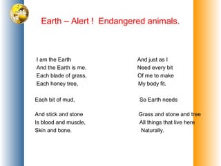 The document discusses several endangered animal species and the environmental threats they face: