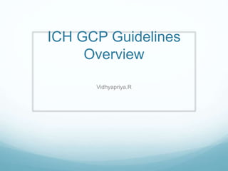 The document provides an overview of ICH (International Conference on Harmonization) and GCP (Good Clinical Practices) guidelines, emphasizing their role in ensuring the ethical and scientific quality of clinical trials. It outlines the responsibilities of various parties involved, including investigators, sponsors, and review boards (IRB/IEC), and highlights the importance of informed consent and quality assurance. Key documents required for compliance and monitoring throughout the clinical trial process are also discussed.