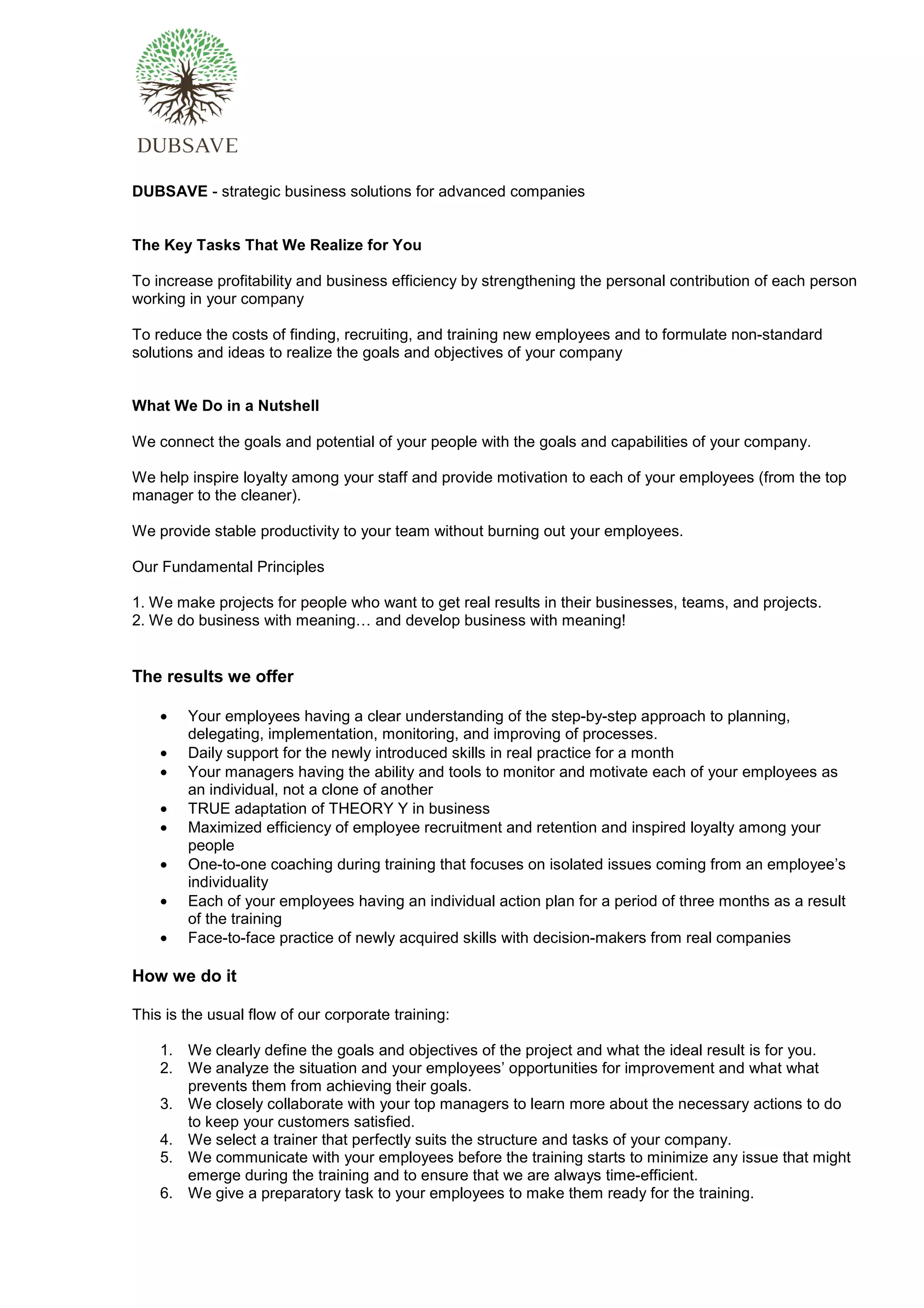We provide strategic business solutions and training programs to help companies increase profitability and efficiency. Our training connects employee goals with company goals to inspire loyalty. We analyze each situation to understand improvement opportunities and train managers to motivate individual employees. The results include maximized recruitment and retention through an approach that adapts theory to each trainee's action plan.