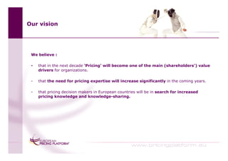 The European Pricing Platform is a neutral, nonprofit knowledge sharing network for pricing decision makers across industries. It aims to promote pricing expertise and knowledge sharing among pricing professionals in Europe through its online portal, training programs, workshops, and networking opportunities. The platform brings together pricing managers and academics to support strategic pricing practices through best practices exchange and new knowledge on pricing tools and methods.
