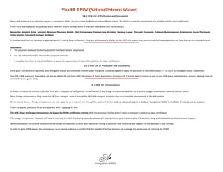This document provides information about the EB-2 NIW (National Interest Waiver) visa category. It describes the eligibility criteria for EB-2 NIW visas based on advanced degrees or exceptional ability. It outlines the documentation required, including letters of recommendation, academic records, licenses/certifications, and evidence of exceptional ability or experience. It also discusses how the NIW can allow entrepreneurs to bypass the labor certification process if their business is shown to provide substantial economic benefits or job opportunities for US workers. Dependents of NIW applicants may also apply to receive green cards once the primary applicant's application is approved.
