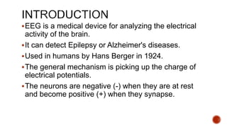 An EEG is a test that detects electrical activity in the brain using sensors placed on the scalp. It is used to diagnose brain conditions like epilepsy and Alzheimer's. During an EEG, electrodes detect brain waves which are amplified and recorded. Abnormal brain wave patterns can indicate conditions affecting the electrical activity in the brain. A neurologist interprets the EEG results to look for normal and abnormal patterns to make a diagnosis.