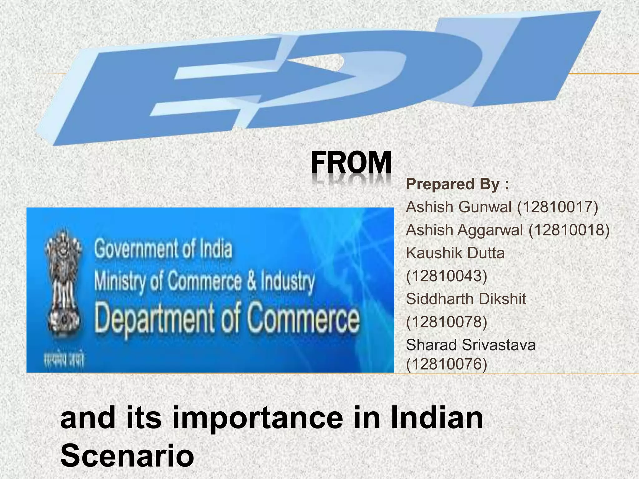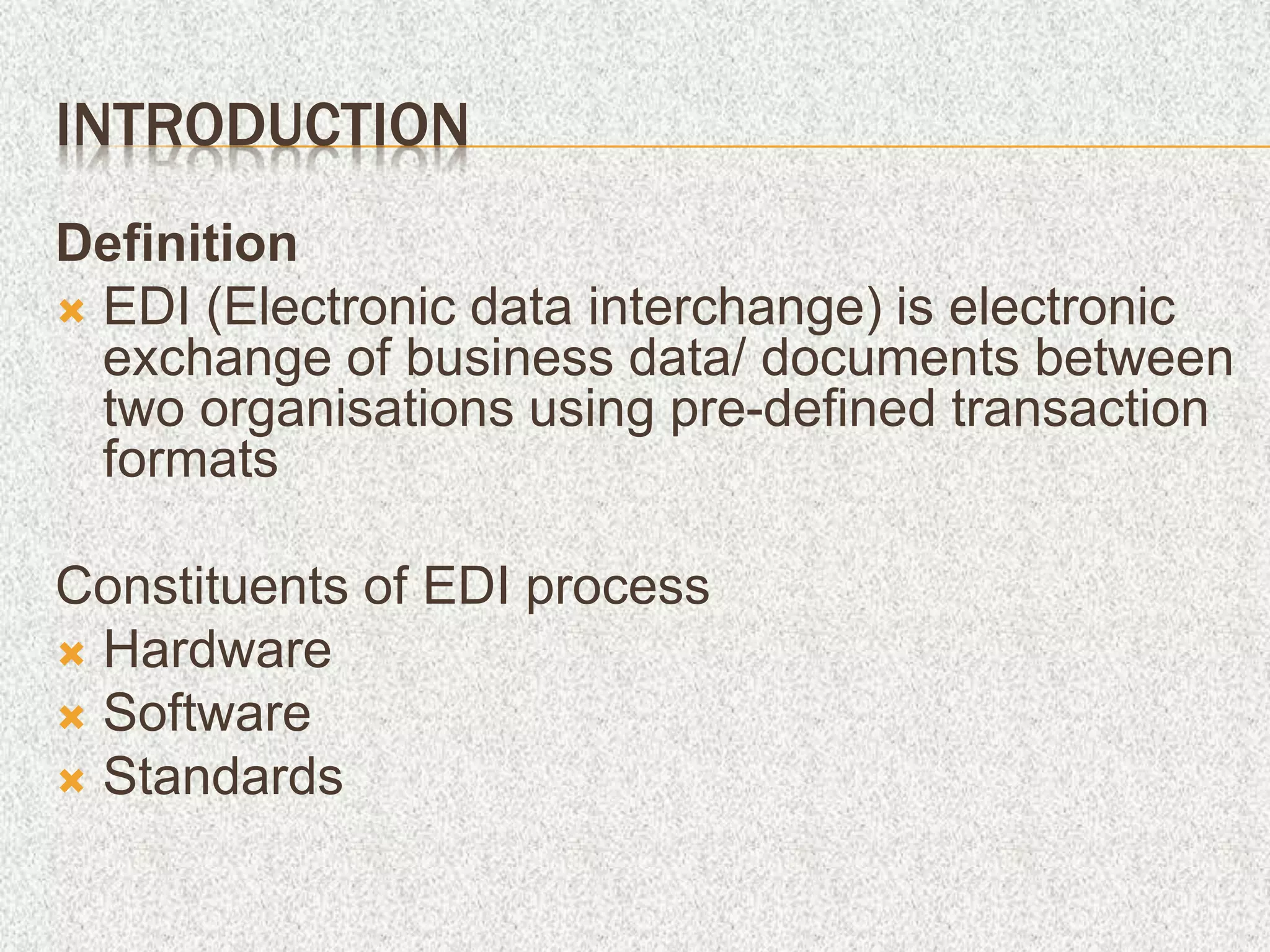 The document provides information on EDI (Electronic Data Interchange) including its definition, history, standards, hardware/software requirements, benefits, applications and implementation in India. It discusses the role of the Ministry of Commerce and EDI Council in promoting EDI adoption. Key sectors implementing EDI include customs, DGFT, banks, airlines and ports to facilitate electronic processing and data exchange for international trade. Challenges around initial costs, maintenance and interoperability between different standards are also mentioned.