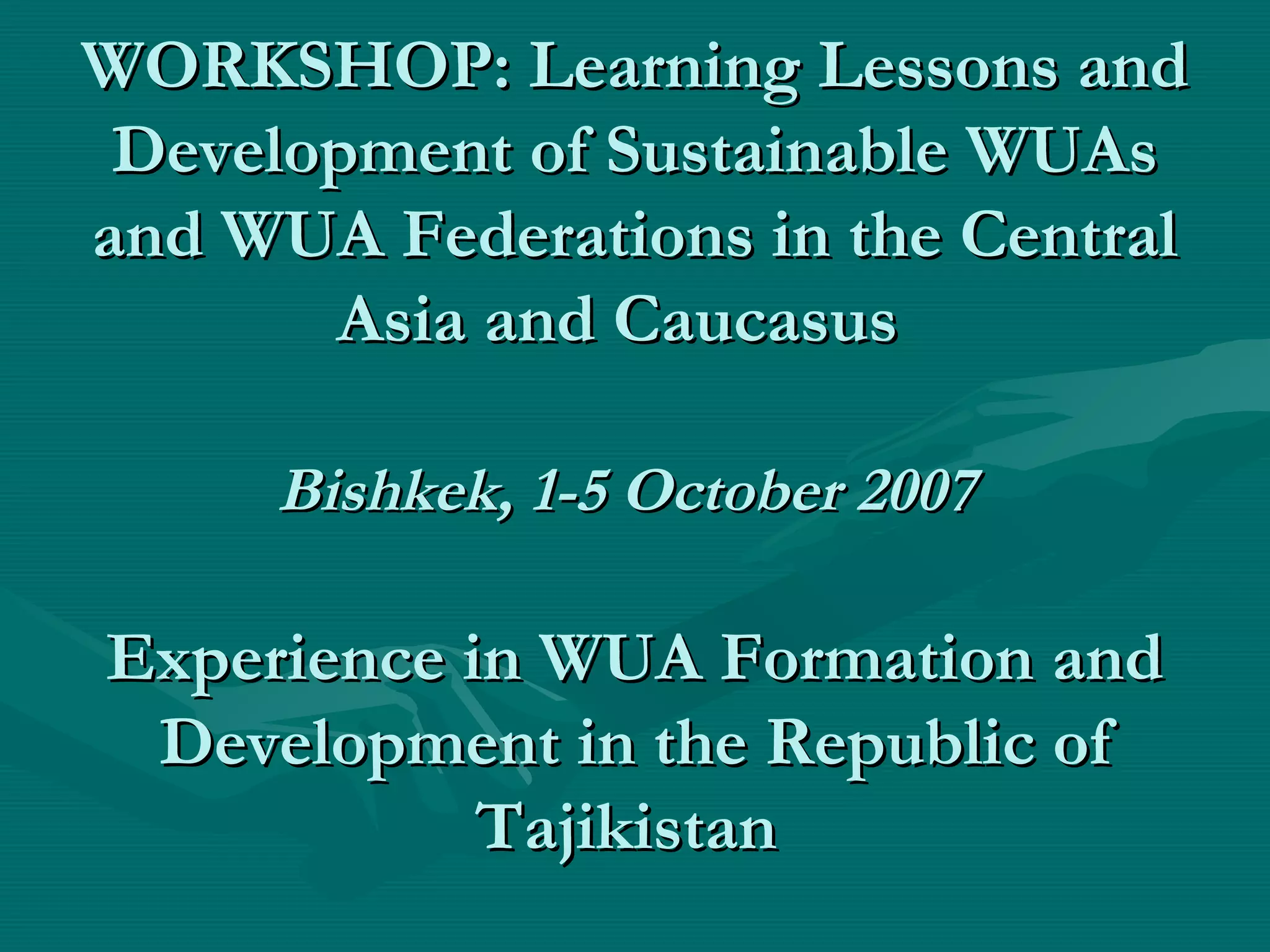 The document provides information about water resources and irrigation in Tajikistan. It discusses the country's land resources, irrigated areas, water resources such as rivers, glaciers, lakes, reservoirs, and groundwater. It also describes the structure of water use by sector. The document then discusses the concept of rational water use and protection in Tajikistan. It outlines the legal aspects of establishing water user associations (WUAs) and the process for their organization and legalization. The document also discusses the development of WUA charters and basic documents, and lists the main tasks of WUAs.