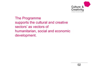 The EU-Eastern Partnership Culture & Creativity Programme supports the cultural and creative sectors in Eastern Europe to promote humanitarian, social and economic development. The program focuses on agenda setting, building alliances, establishing a positive climate for culture, providing evidence and learning, building capacity, and mainstreaming Eastern Partnership culture. It is led by a core team in Kyiv and country coordinators, and supports increasing cultural contacts, sharing knowledge and coordinating donor information.