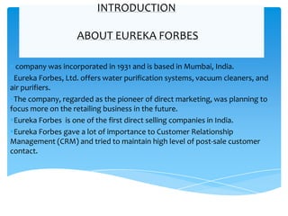 Eureka Forbes is an Indian company established in 1931 that offers water purification systems, vacuum cleaners, and air purifiers. It has historically been a leader in the Indian market with over 75% market share for vacuum cleaners and 85% for water purifiers. The study examined Eureka Forbes' organizational structure and found that it primarily uses a mechanistic structure with strict departmentalization and chains of command. However, communication breaks down at lower levels and employees feel there are insufficient opportunities for innovation or creativity. The researchers suggest adopting a hybrid mechanistic-organic structure to give middle managers more flexibility while maintaining core processes.