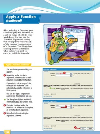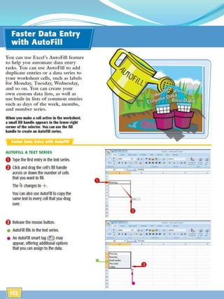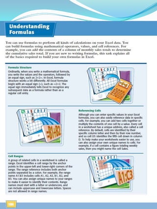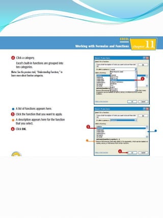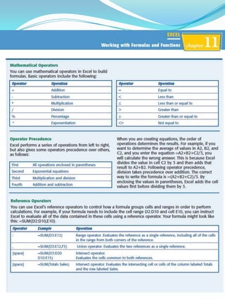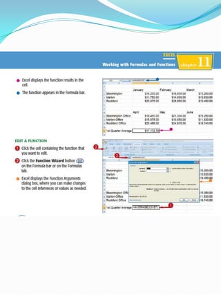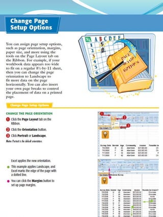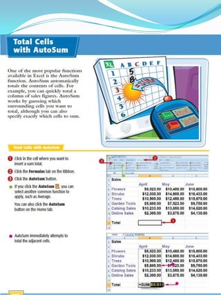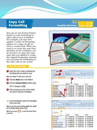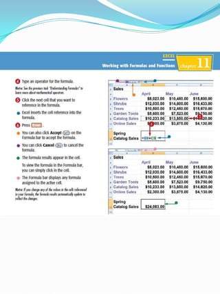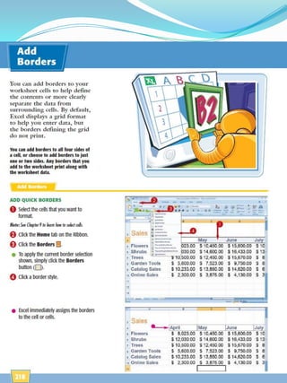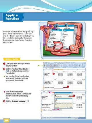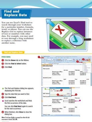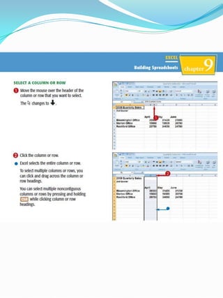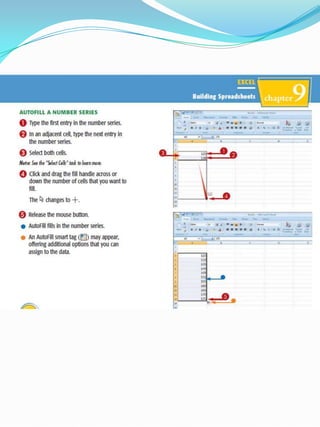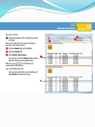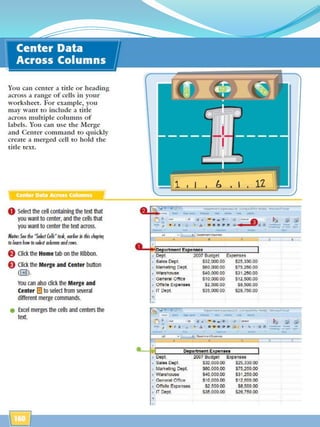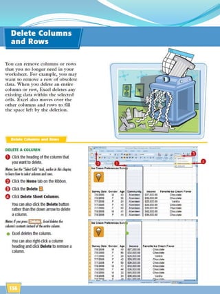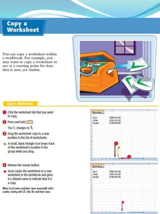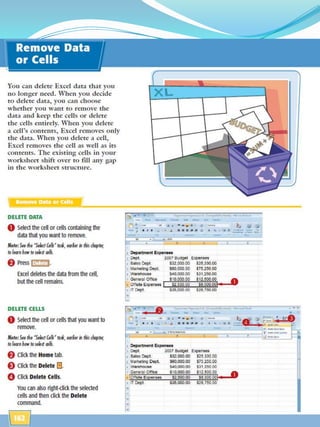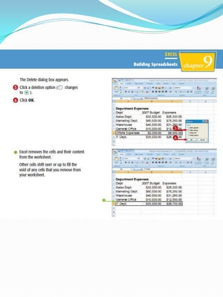 The document describes key parts of the Microsoft Excel 2007 interface such as the ribbon, worksheet tabs, row and column headings, scroll bars, and active cell. It also provides instructions for renaming and deleting worksheets, inserting new worksheets, changing font and size, data color, number of decimals, and cell alignment.