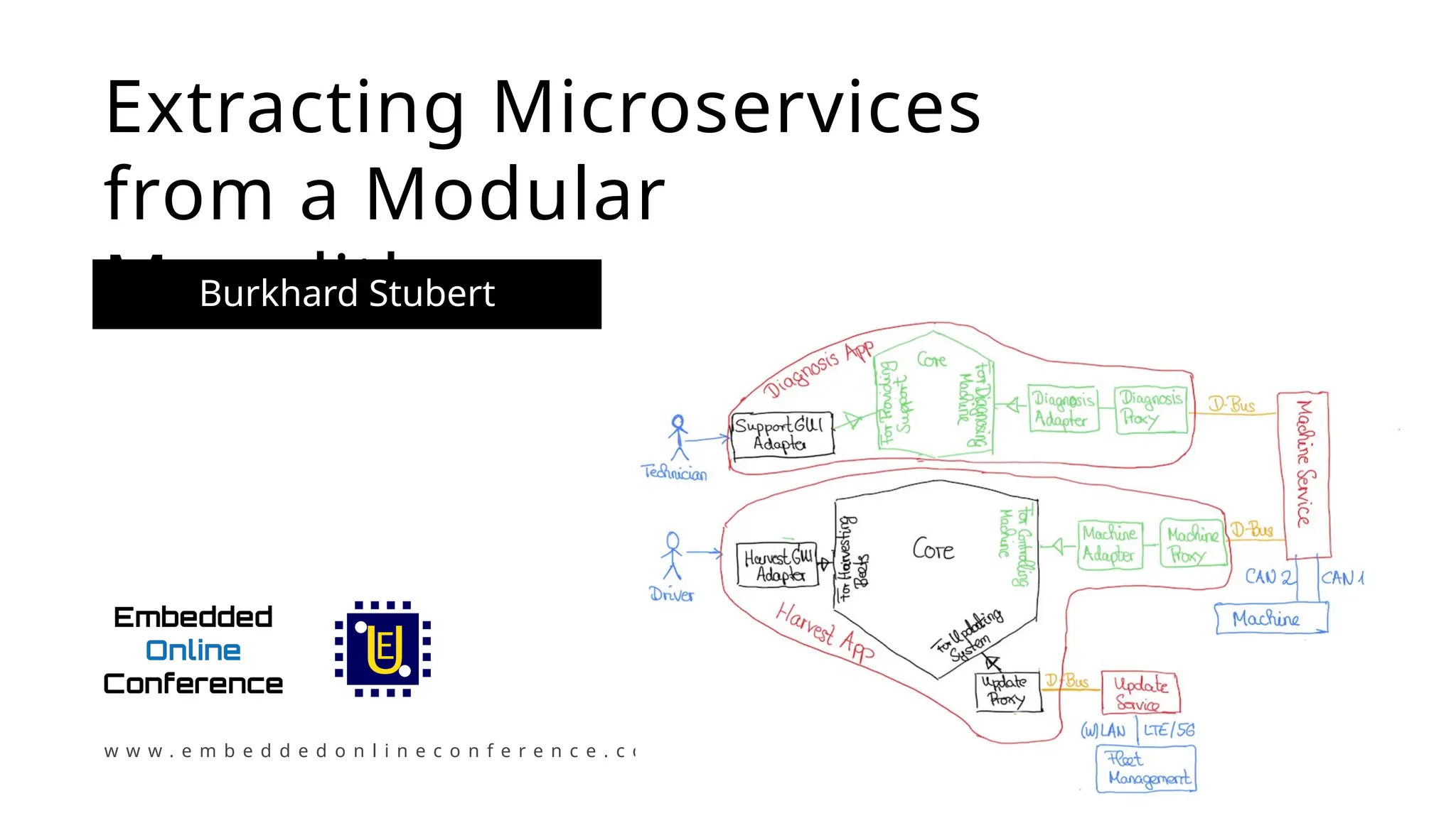 A modular monolith based on the ports-and-adapters architecture is an excellent starting point for extracting microservices. A microservice shares the same traits as an adapter together with its port – and additionally runs in its own process. Introducing a microservice should have a good reason, because it comes with some extra complexity. We extract an update and diagnostic service from a driver terminal of a harvester.