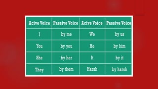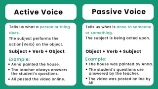 The document discusses the differences between active and passive voice in writing. In the active voice, the subject performs the action, while in the passive voice the subject receives the action. Certain types of writing, like news reports, are better suited to the passive voice when the performer of the action is unknown or unimportant. However, the active voice is generally clearer and more direct. Knowing when to use active or passive voice is important for effective writing.