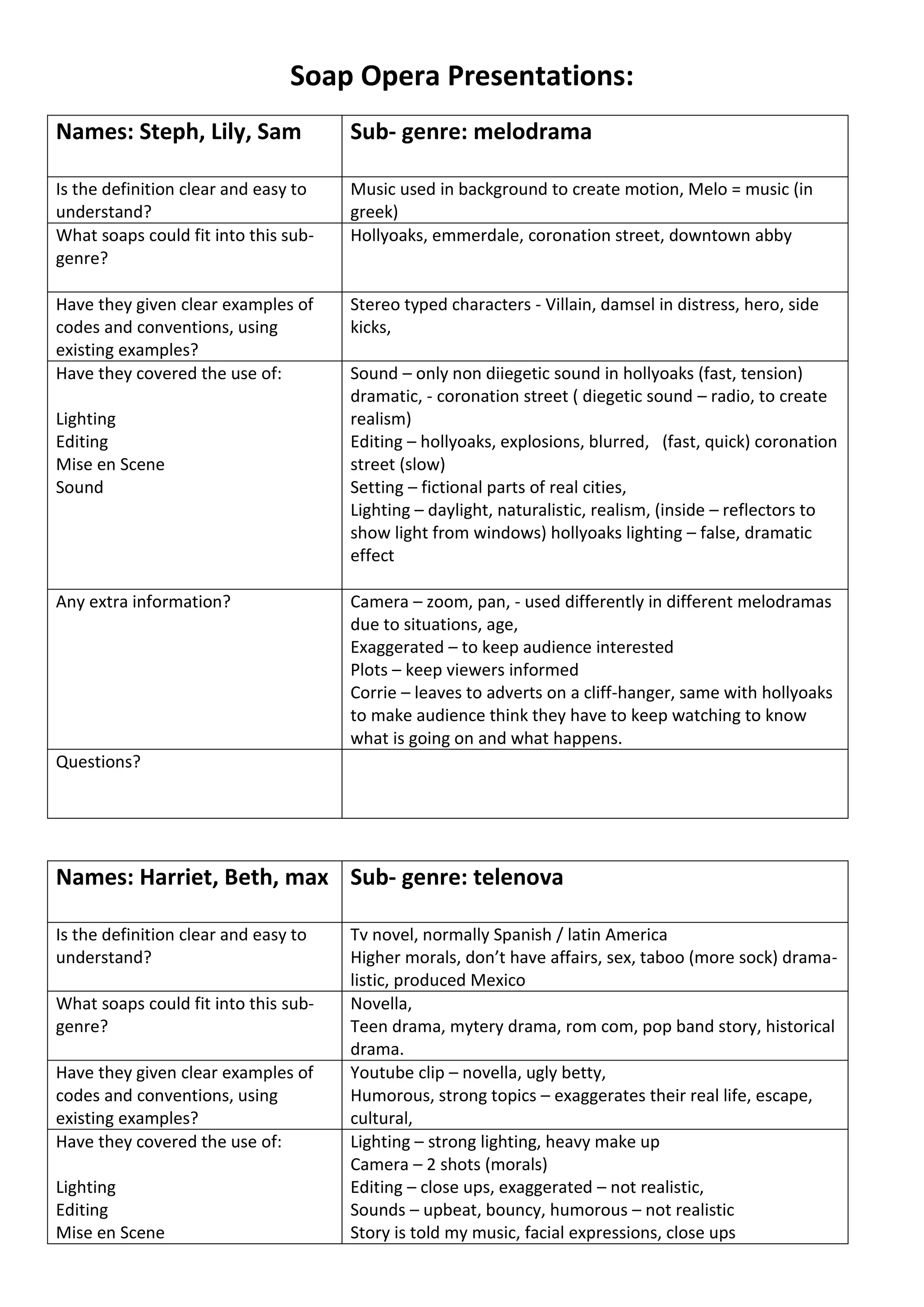 This document discusses several soap opera subgenres including melodrama, telenovela, American fantasy, Australian soaps, and realism. Key points include examples of soaps that fit each subgenre, conventions used such as lighting, editing, sound, and examples of stereotypical characters. Codes and conventions are compared across subgenres.
