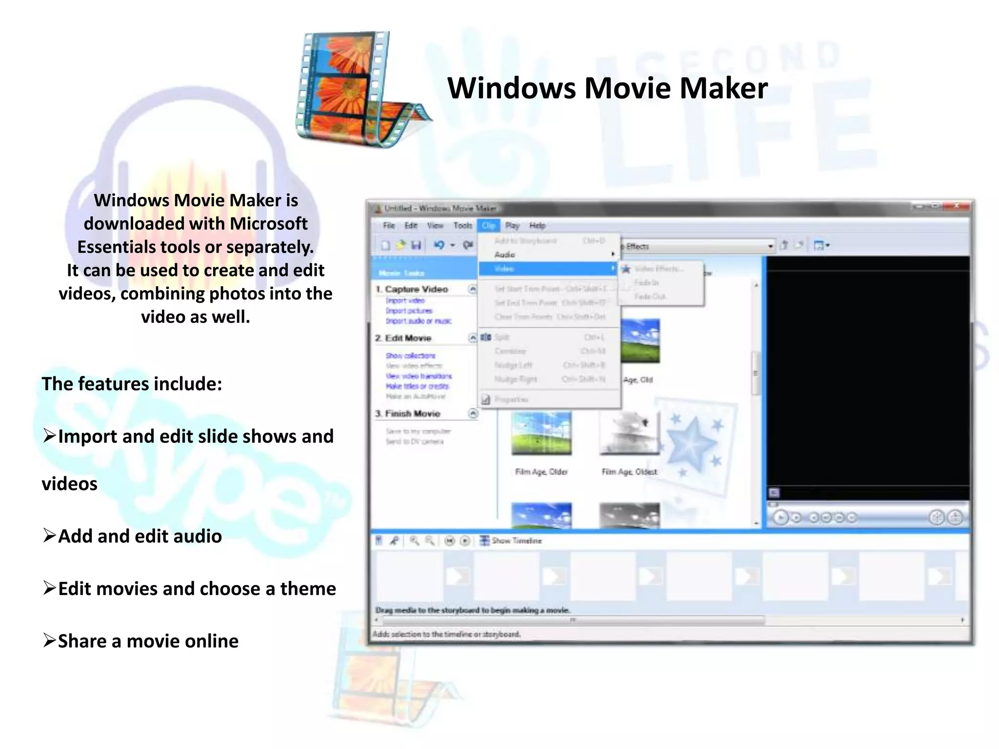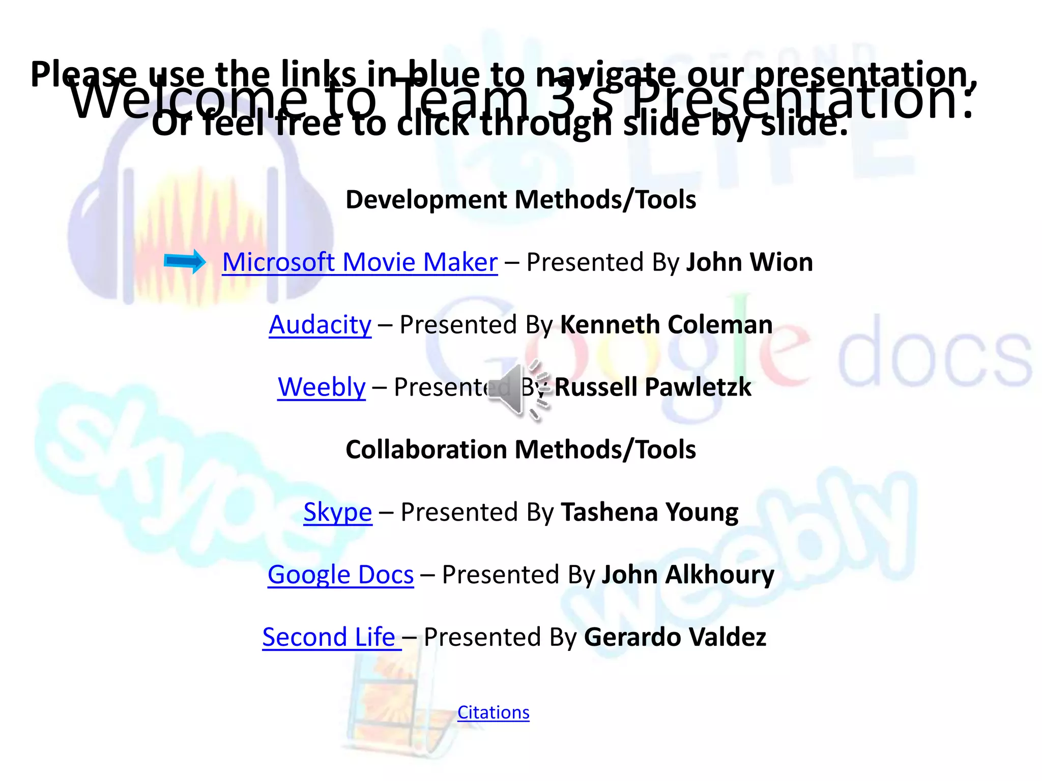The document provides an overview of presentation tools including Windows Movie Maker, Audacity, Weebly, Skype, Google Docs, and Second Life. It summarizes the key features and uses of each tool. For example, it notes that Windows Movie Maker allows importing and editing videos and adding audio, Audacity is a free open source audio editing software, and Google Docs allows real-time collaboration on documents from any location. The document also includes citations for the sources of information presented.