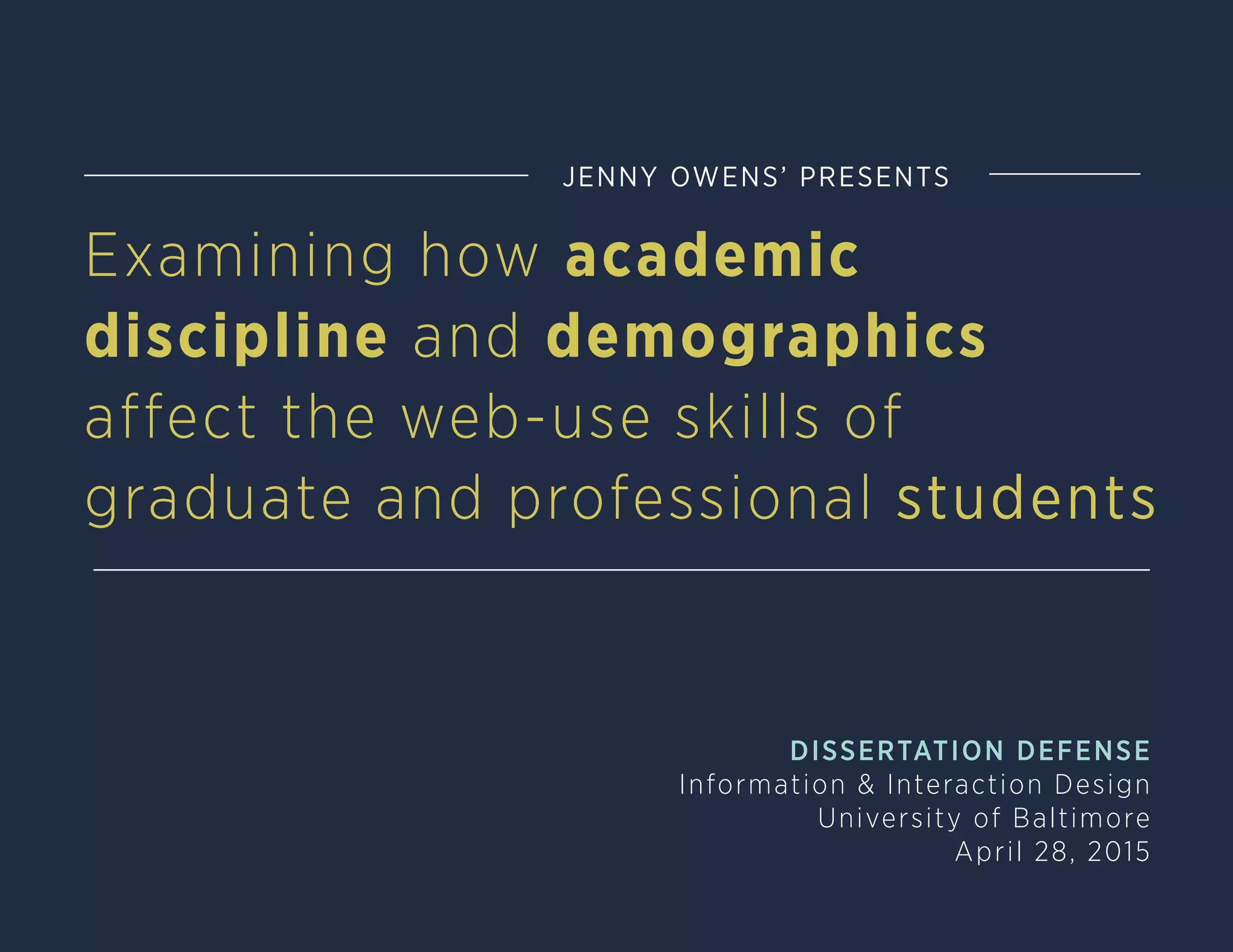 The dissertation by Jenny Owens investigates how academic discipline and demographic factors impact the web-use skills of graduate and professional students at the University of Baltimore. It reveals significant variations in web-use abilities across disciplines, gender, and race, highlighting the influence of social factors on digital literacy. The study's findings aim to inform initiatives aimed at addressing digital inequality in higher education.