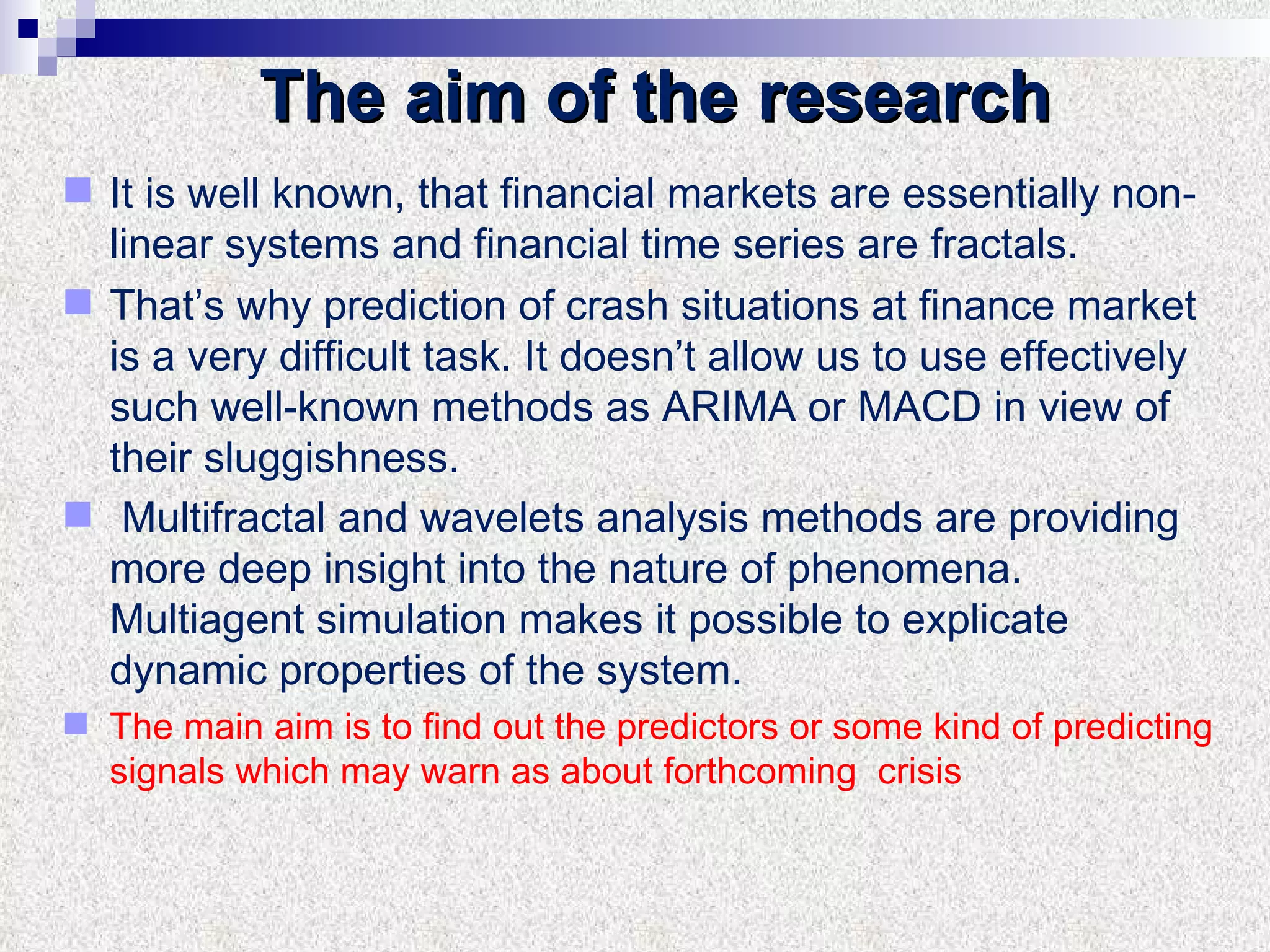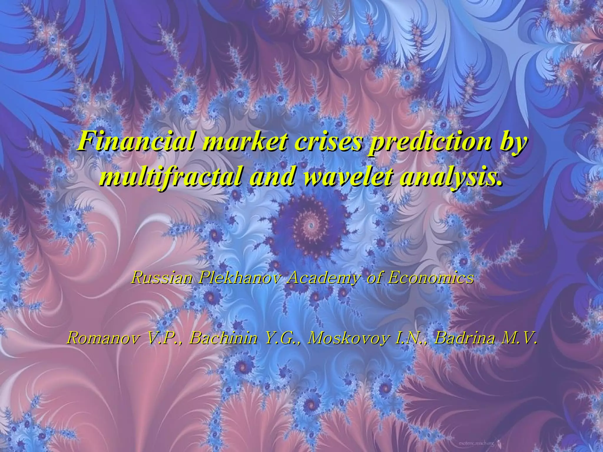 The document discusses using multifractal and wavelet analysis to predict financial market crises. It analyzes various financial market indices during crisis periods from 1987 to 2008. Fractals are described as shapes that appear similar at different scales and have non-integer dimensions. Financial markets exhibit fractal properties with long-term memory and volatility clustering. The researchers use techniques like Hurst exponent analysis, time series partitioning, and calculating partition functions and fractal dimension spectra to analyze indices for signs of an impending crisis. The width of the multifractal spectrum is proposed as an indicator, with wider widths preceding crashes.