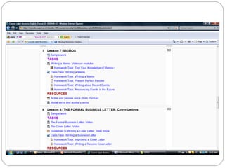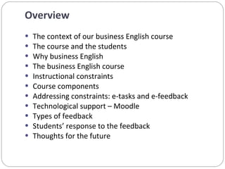 The document summarizes the use of computer-mediated e-feedback in a large business English writing course at Ruppin Academic Center in Israel. The course aimed to develop students' business writing skills through online tasks and feedback provided via the Moodle learning management system. A survey found that most students found the general e-feedback on their writing assignments to be helpful in improving their work and learning. The feedback allowed for ongoing, customized feedback to individual students in a large class setting.