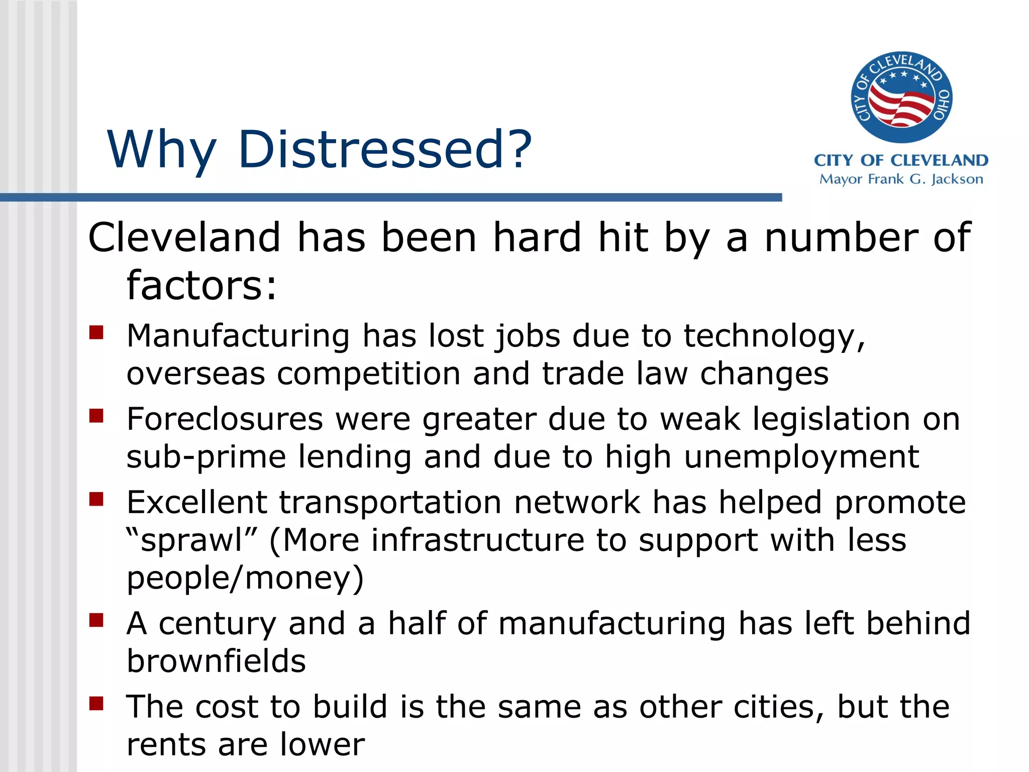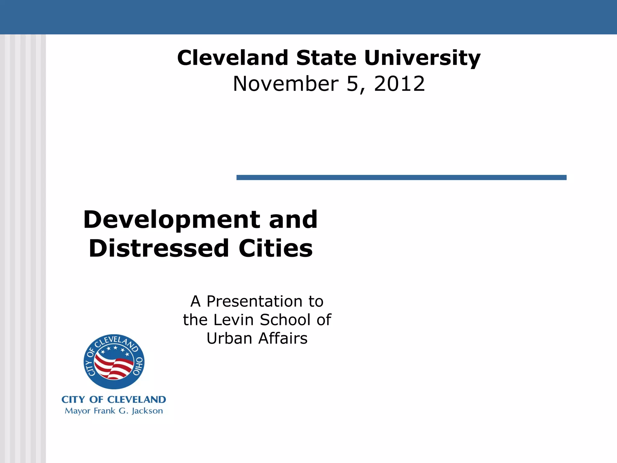 This presentation discusses development challenges facing distressed cities like Cleveland. Cleveland has struggled with job losses in manufacturing and foreclosures, and now deals with vacant and abandoned properties, illegal dumping, and poverty. However, the presentation outlines Cleveland's efforts to address these issues through a unified strategy of education reform, partnerships, and place-based economic development focused on clusters like health technologies. Anchors like universities and initiatives like green cooperatives aim to create local jobs and opportunity.