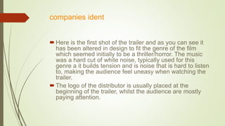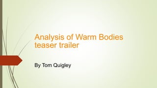 This document analyzes the trailer for the film Warm Bodies. It examines elements at both the micro and macro level. At the micro level, it analyzes aspects like mise-en-scene, camerawork, editing, and sound design. It finds the trailer uses dark colors and lighting to build suspense, close shots to show emotion, and quick cuts to keep pace. At the macro level, it determines the genre is a thriller/romance. It also analyzes the narrative, representation of characters, and target audience of ages 15-24.