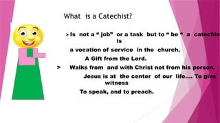A catechist is a vocation of service within the church, centered around sharing and living the teachings of Jesus. They play essential roles as heralds of tradition, storytellers of faith, and transform culture through their teachings. Effective catechists are knowledgeable, respectful of their students, and embody the virtues of Christ in their interactions.