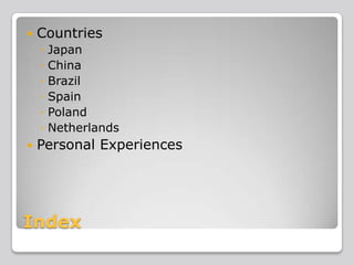 This document discusses English language education in several countries. It provides an overview of when English is introduced, how it is taught, and English proficiency levels in Japan, China, Brazil, Spain, Poland, and the Netherlands. It also shares personal experiences learning English from students from Japan, China, Brazil, Spain, and the Netherlands. They discuss when they started learning English, what helped them improve, and any challenges they faced.