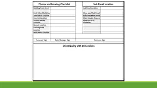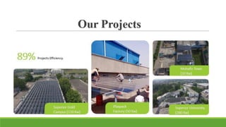 The document provides information about the components and types of solar photovoltaic systems. It discusses solar panels, inverters, mounting structures, and different types of PV systems including on-grid, off-grid, and hybrid systems. It also outlines the process for installing a solar system which includes site surveying, system designing, procurement, construction of mounting structures, installation of panels and inverters, and commissioning.