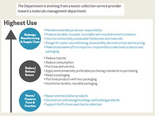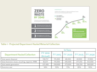 This document discusses moving Anne Arundel County towards zero waste. It provides background on Community Research, a nonprofit working on zero waste campaigns. It defines zero waste as eliminating waste disposal and designing products and systems to avoid waste. It discusses nuts and bolts definitions, such as reducing landfilling to less than 10% of waste. It provides examples of zero waste initiatives and policies from other jurisdictions that could be models.