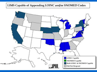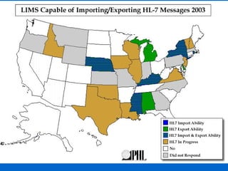 The Association of Public Health Laboratories (APHL) aims to promote public health laboratories through quality laboratory practices. APHL conducted surveys of public health laboratories' Laboratory Information Management Systems (LIMS) which found that most states have multiple LIMS, are seeking to replace aging systems, and exchange data through various methods with limited compatibility. APHL is working with partners to develop interoperable electronic laboratory data exchange networks.