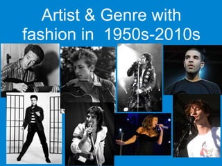 The document summarizes fashion trends in music and clothing from the 1950s to the 2010s. In the 1950s, classic music dominated and men wore dark, conservative suits. Casual skirts and pants became popular for women. In the 1970s, disco music rose in popularity thanks to artists like the Bee Gees. Fashion included bell bottom jeans and platform shoes. Punk fashion also emerged. By the 1990s, grunge music and fashion grew influential due to bands like Nirvana. From 2010 onward, colors like teal and neon became trendy as did skinny jeans, while pop, hip hop, electronic, and dubstep music grew in popularity.