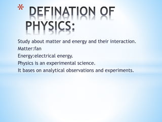 Physics is the study of matter, energy and their interaction. It is an experimental science based on observation and experiments. Physics plays a vital role in many fields like cloud formation, electricity, cooking, defense systems, transportation, home appliances, and medicine. Modern physics includes quantum physics which is concerned with invisible packets of energy called quanta or photons. Physics has made discoveries in electricity, transportation, and home appliances that have been important for modern life.