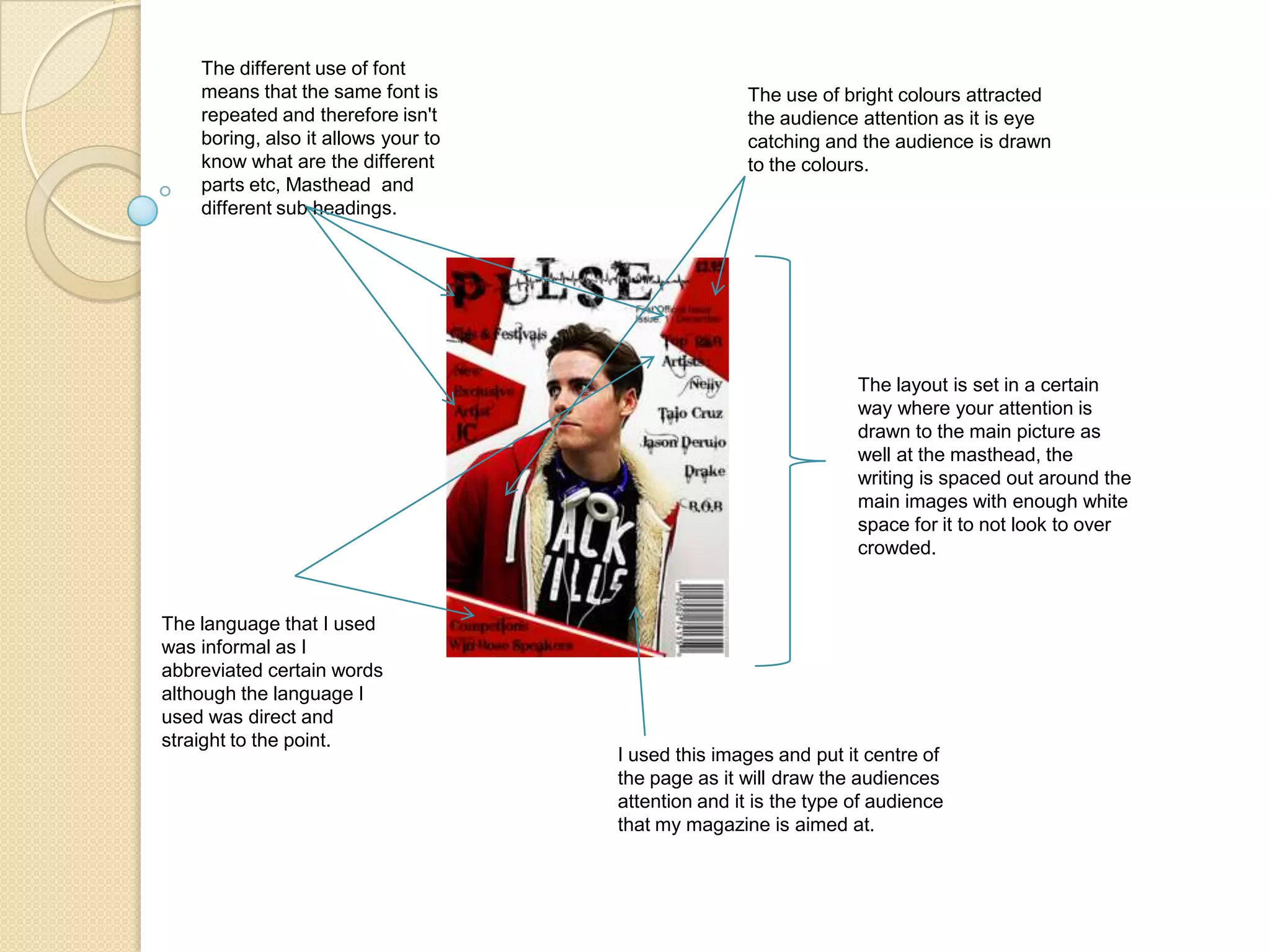 The document discusses how the magazine addressed its audience through the use of different fonts, bright colors, organized layout, and informal language. Images and photos were used prominently throughout to draw attention and represent the target social group. Feedback was also provided, praising the eye-catching house style, relevant information, appeal to the target demographic, and easy to follow layout.