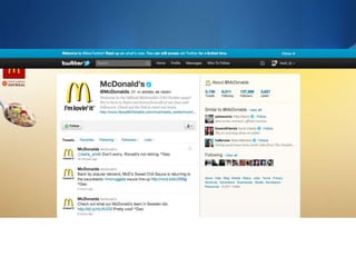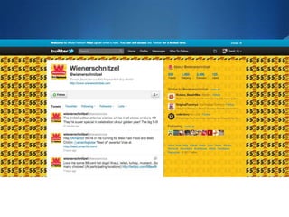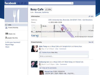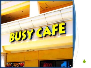 This document outlines a social media strategy plan for a Chinese restaurant called Busy Cafe. It discusses goals of building customer relationships, attracting new customers, and getting reviews. The plan analyzes the restaurant's Facebook, Twitter, YouTube, and Foursquare presences and provides recommendations. Suggestions include improving Facebook with a new profile picture and regular posts. Twitter strategies include sharing daily deals and building friendships. A cooking guide video on YouTube could advertise the restaurant. The document also considers creating a mobile app to make ordering easy.
