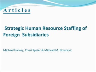 The document discusses strategic international human resource staffing for foreign subsidiaries. It proposes that as organizations internationalize, their staffing strategies should evolve from relying primarily on expatriates, to also utilizing inpatriates, third country nationals, and local nationals based on the level of goal congruence and knowledge symmetry between the parent company and subsidiary. It outlines eight propositions regarding optimal staffing choices at the multinational and global stages of internationalization depending on effort/outcome and cultural symmetry. It also provides recommendations for selecting and supporting inpatriate managers to address their unique adjustment needs.
