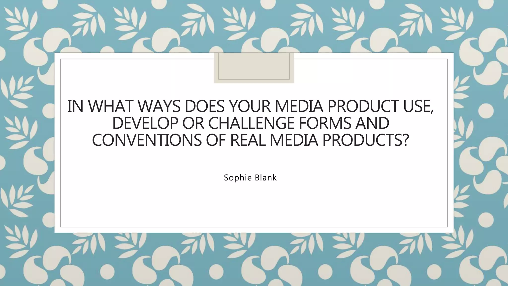 The document discusses the forms and conventions used in media products and how the student's media product challenges or develops these conventions. Specifically: