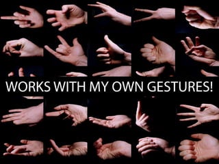 The document describes a system for gesture recognition using accelerometer devices and APIs. It includes hardware devices with built-in accelerometers, input and output protocols, a gesture application server, and APIs for recognition. The system also involves mobile apps, software vendors, device manufacturers, services, partnerships and community support.