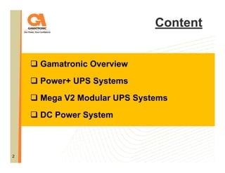 This document provides an overview of Gamatronic power systems, including UPS systems and DC power systems. It discusses Gamatronic's history and product range. For UPS systems, it describes the Power+ and Mega V2 modular UPS families in detail, including their features such as redundancy, scalability, efficiency, and battery configurations. It also discusses DC power systems for telecom applications, focusing on the benefits of the 1U DC modular rectifier solution such as high efficiency, scalability, reliability and environmental friendliness.