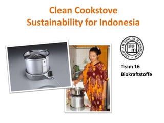 This document proposes a project to distribute clean cookstoves in Indonesia to reduce carbon emissions. Over 5 years, the project aims to distribute 10,000 cookstoves in Majalengka, West Java and partner with local companies to supply used cooking oil to fuel the stoves. The project expects to generate revenue from cookstove sales and carbon credits from verified emissions reductions. Financial projections estimate the project will reach profitability in year 2 and have a 50% internal rate of return over 5 years.