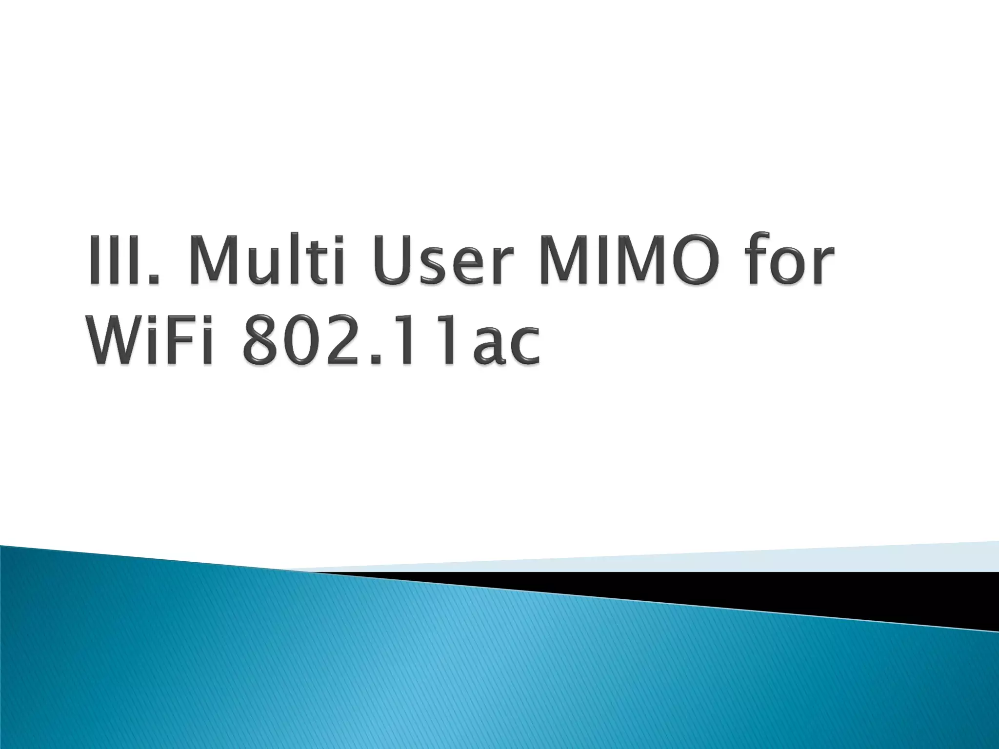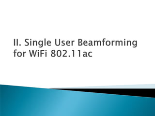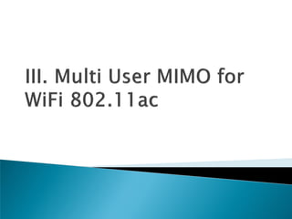 This document discusses various MIMO techniques including single-user and multi-user MIMO. It begins with an overview of STBC, which is used in 802.11ac and provides transmit diversity with low cost. Spatial multiplexing allows multiple parallel channels to improve throughput. For single-user MIMO, transmit beamforming enhances signal reception through precoding techniques like SVD that establish parallel channels. Multi-user MIMO further increases capacity but introduces interference that must be managed through precoding and receiver techniques like zero-forcing. Channel feedback is also required to implement beamforming and precoding.
