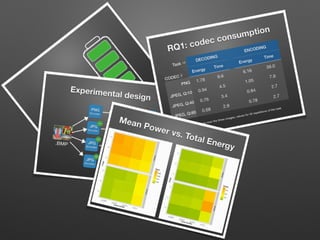 The document analyzes energy consumption in various image encoding and decoding algorithms, specifically comparing formats like PNG and JPEG at different quality levels. Key findings indicate that decoding PNG images consumes approximately twice the energy of JPEG, with encoding PNG requiring six times more energy. The study also correlates energy consumption with computational performance, highlighting questions about identifying power-efficient algorithms with similar complexity.