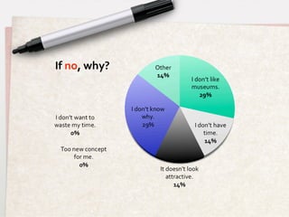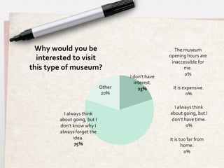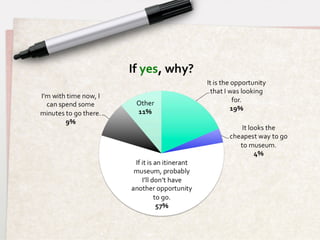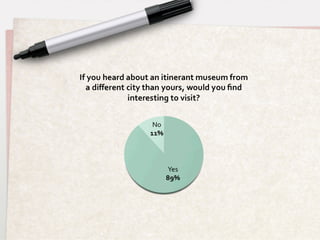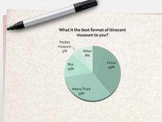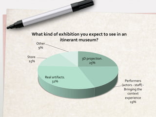 The document discusses research conducted to design a new itinerant museum service concept that would make museums more accessible to different user groups. Interviews and questionnaires with potential users found that people want museums closer to home with flexible hours and would be interested in a traveling museum that brings artifacts and exhibitions directly to communities. The research also benchmarked existing mobile museum services and identified families, older adults, people with disabilities, and rural residents as key target user groups for a new itinerant museum service.