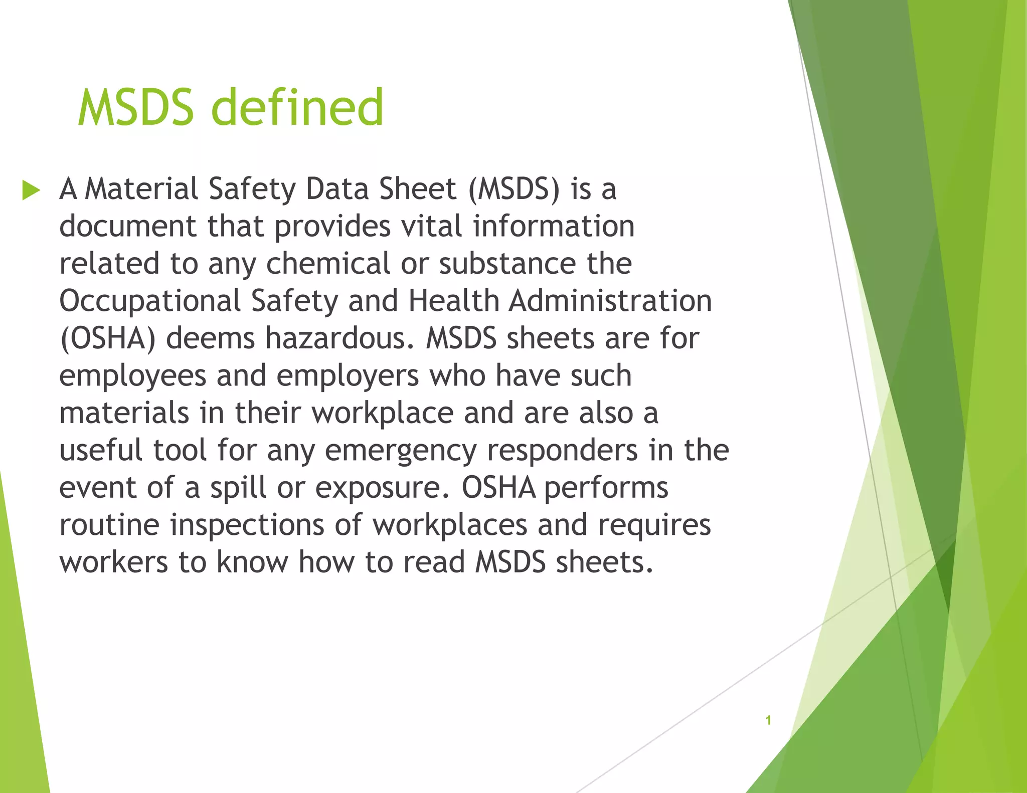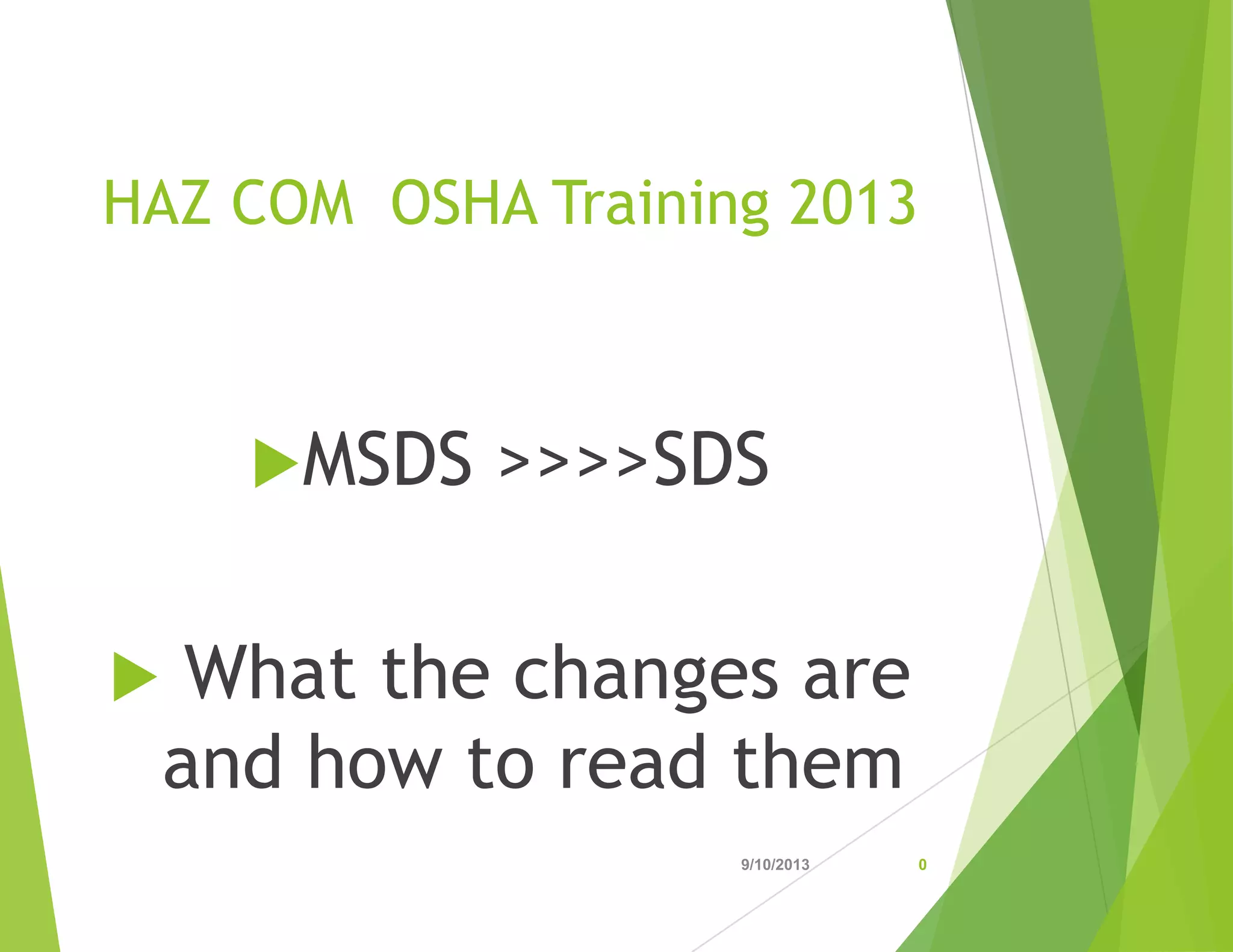 This document provides an overview of changes to material safety data sheets (MSDS) that are being implemented to comply with the Global Harmonization Standard (GHS) by 2015. Key changes include MSDS becoming safety data sheets (SDS) with a standardized 16-section format. Labeling must include standardized signal words, pictograms, hazard statements and precautionary statements. The document reviews the new SDS format and provides examples of what the new labels will look like. It emphasizes the importance of understanding the new labeling system so workers can safely handle, store and respond to hazardous chemicals.