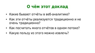 Доклад Михаила Якшина обсуждает методы веб-аналитики и их реализацию, включая стандартные и нестандартные отчёты. Основное внимание уделяется способам параллелизации расчётов и объединения различных отчетов для повышения эффективности. В результате, пользователи могут настраивать свои отчёты, а система экономит значительное количество вычислительных ресурсов.