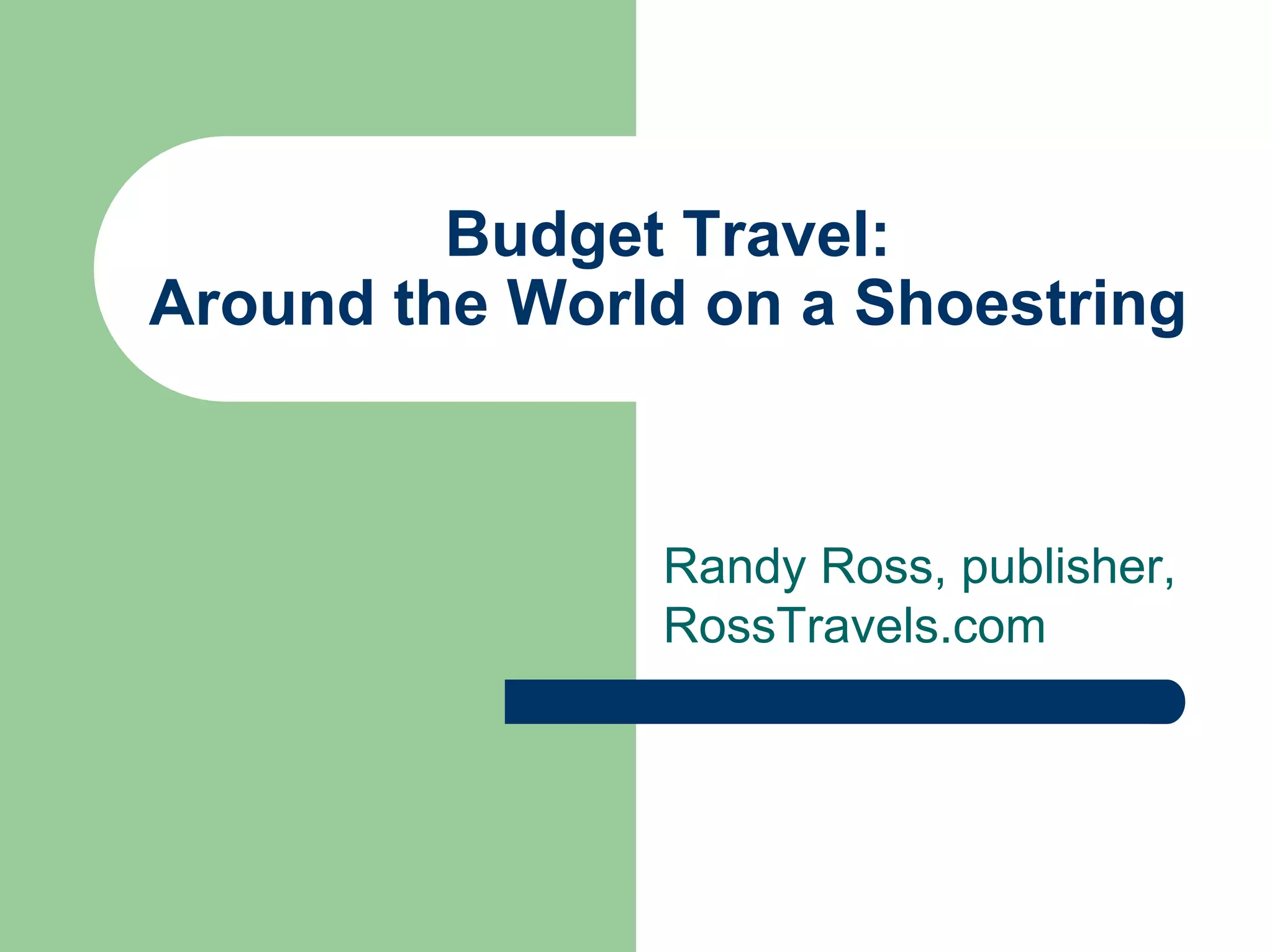 The document provides insights from Randy Ross, a budget travel expert, aimed at first-time world travelers about planning extended trips. It covers four key steps for planning—destinations, transportation, accommodations, and pre-trip preparations—along with budgeting strategies. Additional advice includes safe travel practices, tips on solo travel, and resources for booking affordable accommodations and flights.