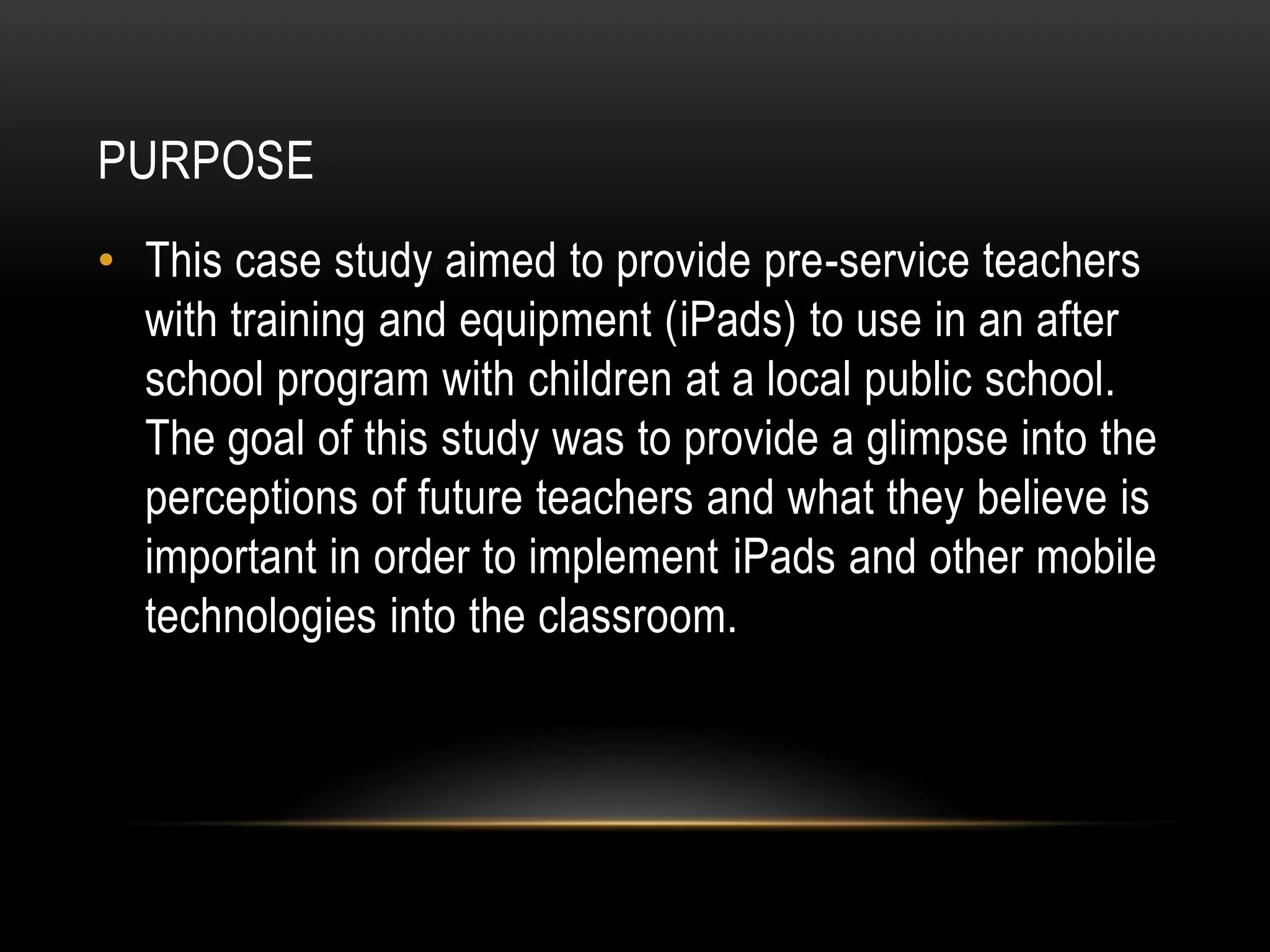 This case study aimed to equip pre-service teachers with iPads for use in a local public school after-school program, highlighting their perceptions on technology integration in education. Findings revealed that while some pre-service teachers had limited prior experience with technology, they recognized the importance of using iPads to engage students and accommodate diverse learning styles. The study suggests that colleges must enhance technology training and provide access to tools for effective teaching practices in the field.