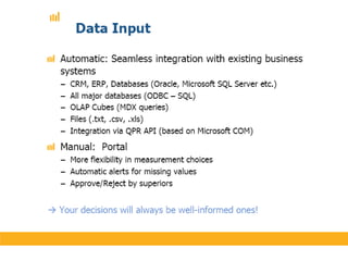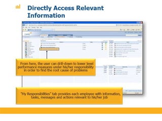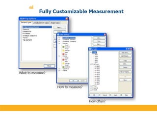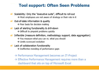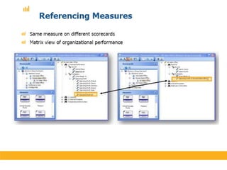 The document discusses various performance measurement frameworks and techniques including the Balanced Scorecard, Total Performance Scorecard, and Six Principles of TPS. It provides an overview of how these frameworks integrate measures across different areas such as learning and growth, business processes, customers, and finances. The document also references several other sources on implementing and applying performance scorecards.