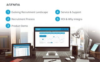 This document provides an overview of iintegra, a recruitment software solution. It begins with the evolving recruitment landscape and challenges businesses face. It then outlines iintegra's recruitment process, including simplifying the process through automation. The document demonstrates iintegra's features like applicant tracking and reporting. It concludes with an overview of iintegra's services, setup process, and potential benefits and ROI for customers.
