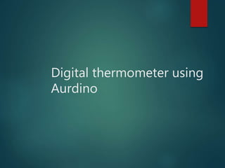 The document discusses a digital thermometer project utilizing Arduino, an LM35 temperature sensor, and a 16x2 LCD display for monitoring temperature. It outlines the thermometer's specifications, operation steps, and code implementation, highlighting its accuracy and portability for various applications. The project can monitor temperatures between -55°C and 150°C and can be adapted for Fahrenheit readings as needed.